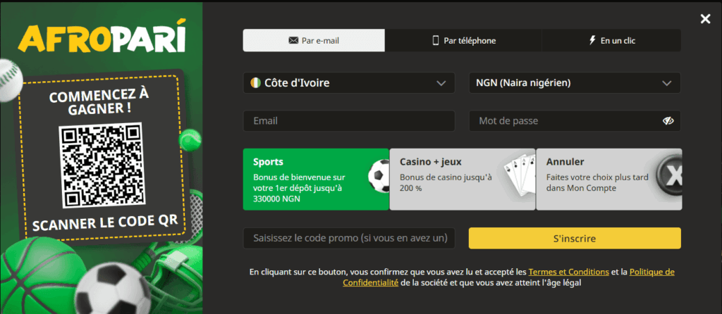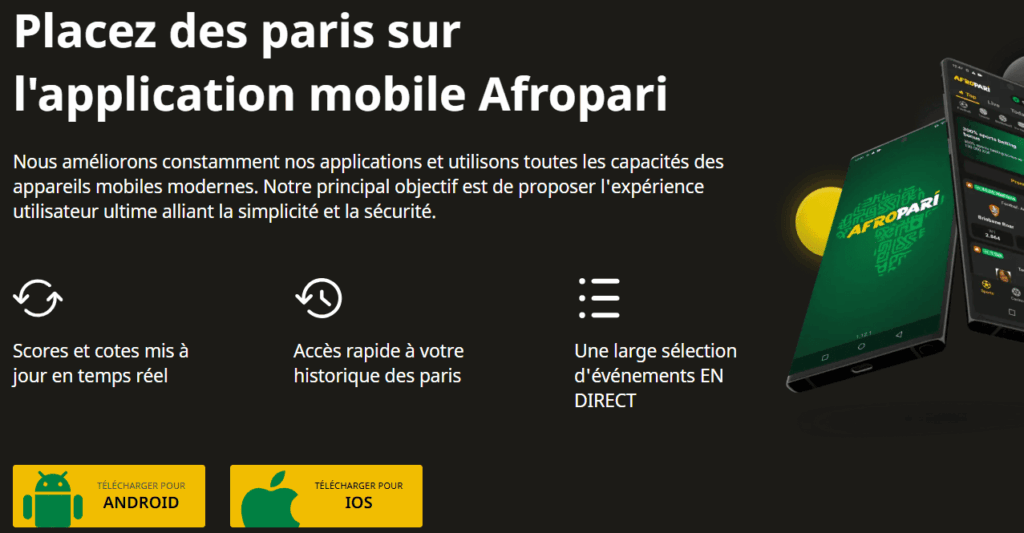 Le bookmaker AfroPari propose deux façons d’interagir : via le site mobile et via l’application. La version mobile est disponible pour les appareils iOS et Android et offre un accès universel aux paris et au casino. L’application, quant à elle, est créée uniquement pour Android, offrant une expérience plus fluide et native.