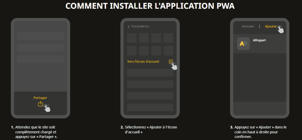 Ouvrez le navigateur Safari et accédez au site officiel d’AfroPari. Après le chargement de la page, appuyez sur l’icône “Partager” – un carré avec une flèche vers le haut. Dans le menu qui apparaît, choisissez l’option “Ajouter à l’écran d’accueil”. Donnez un nom au raccourci et confirmez l’action. Une icône apparaît maintenant sur l’écran d’accueil et ouvre le site en un seul clic.